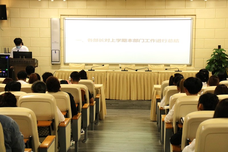 在大会的最后,团总支书记张琼英做总结点评。她肯定了大家积极投身团学工作的热情,鼓励学生干部把握住每个机会,不断提高、磨砺自己。并对大家日后的工作寄予厚望,希望每一个团总支学生会成员勿忘初心,保持对团学工作的热情,不负青春,以最好的状态投入到学习和工作中去,切实服务好广大同学,用行动践行承诺,以行动创造价值。