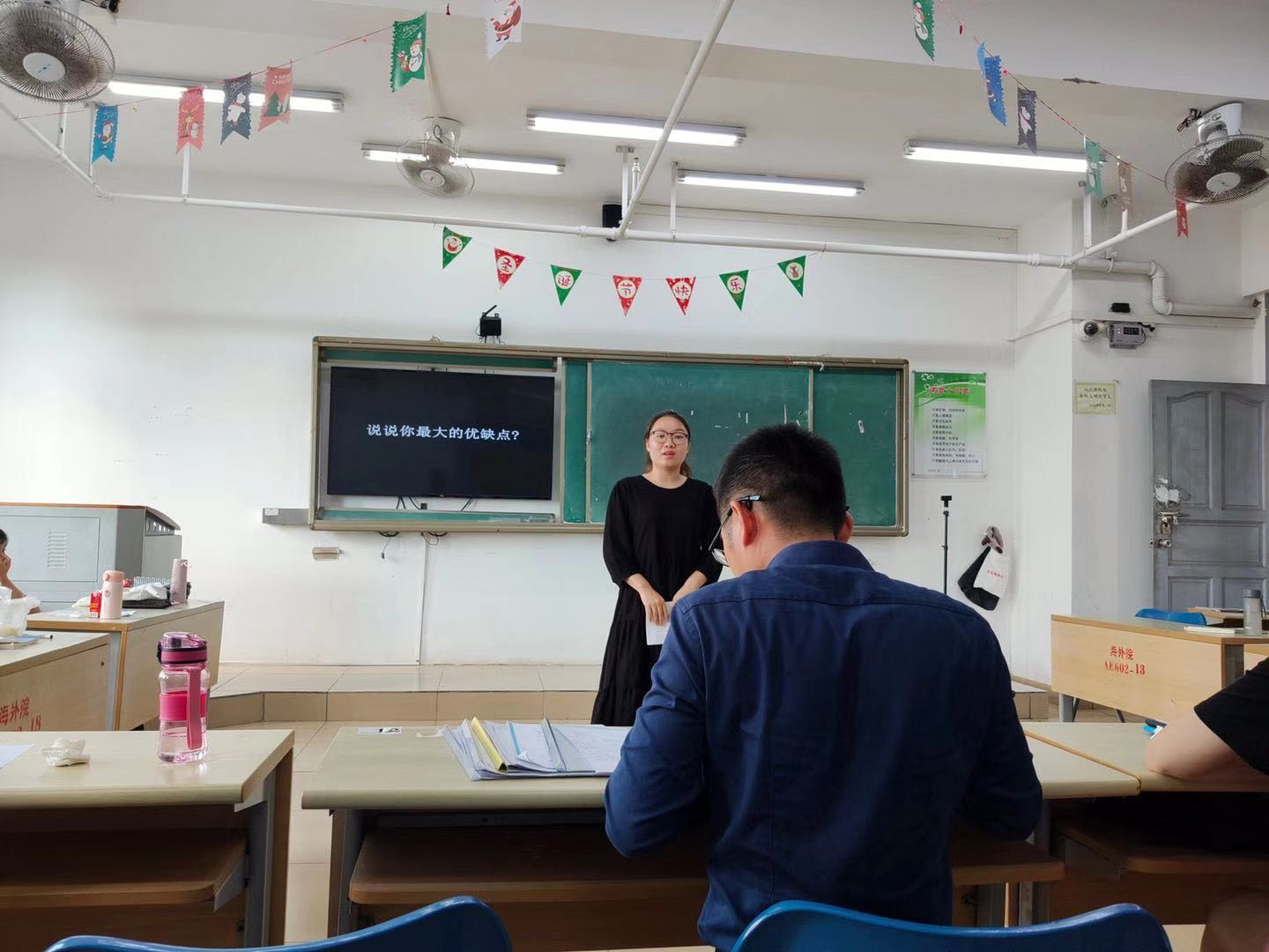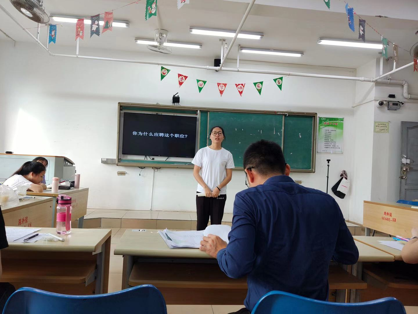 黄健老师先组织同学们将教室里的桌椅摆放成U字型。中间黄健老师扮演面试官,两边学生观摩。
