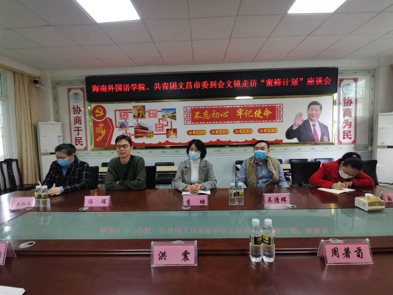2021年1月15日下午,英语系党总支副书记吴清晖率队前往文城镇、东郊镇、会文镇看望我系第七期“蜜蜂计划”大学生岗位实践的学生,共青团文昌市委员会副书记李珊、中西部志愿者林水灵以及英语系相关教师、辅导员陪同往。