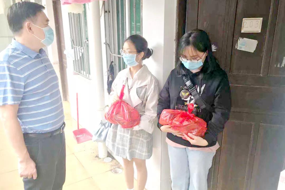 2月11日,英语系党总支副书记吴清晖、学生科长钟大强、学生宿舍管理负责人邢谷鑫到学生宿舍看望慰问了我系6名留校学生,并为同学们带去了牛奶和水果等爱心礼包。