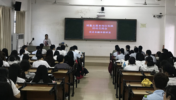 为了帮助学生近距离接触社会和工作,拓宽学生的知识面,增强学生的感性认识,锻炼学生的岗位技能,培养学生独立分析问题和解决实际问题的能力,能将理论知识与岗位实践相互结合,学会生活,学会做事,学会做人,学会与人相处,学会团结协作。2018年5月7日上午8:30在AE102进行了博鳌志愿者岗位实践活动交流会,会上来自16翻译班和17英教班获得本年度博鳌志愿者岗位实践活动优秀荣誉称号的同学与17翻译班、17英教班的同学积极分享自己的岗位实践心得体会,并对下一届要去博鳌岗位实践活动的志愿者提出中肯的建议。