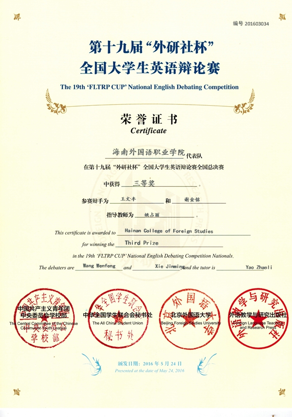 5月18日至24日,第十九届“外研社杯”全国大学生英语辩论赛总决赛在北京外国语大学举行。作为国内水平最高的大学生英语口语赛事,本届比赛有包括来自我国内地、香港、澳门、台湾在内的122所高校参加,其中不乏众多“211”、“985”高校,我院在比赛初赛环节从全国500余所高校中脱颖而出,成为全国唯一一所晋级总决赛的高职高专院校,也是我省唯一晋级总决赛的高校。