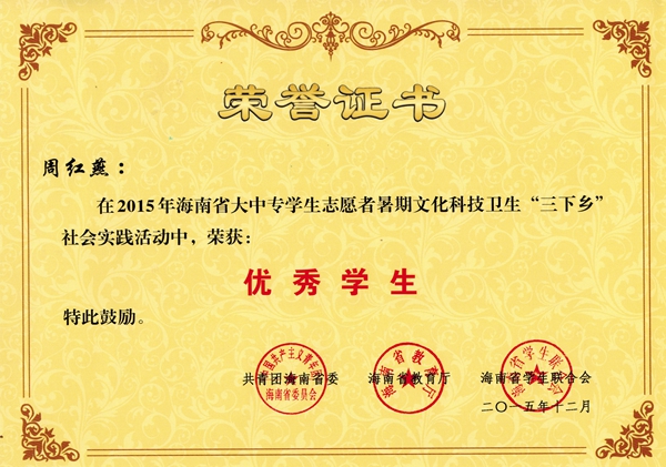 我系周红燕同学在2015年海南省大中专学生志愿者暑期