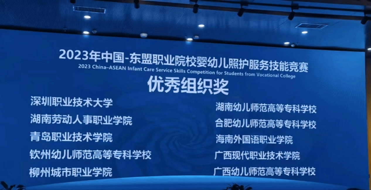 为了促进婴幼儿照护服务相关专业建设与发展,提升婴幼儿照护服务技能人才水平,11月16日-18日,2023年中国—东盟职业院校婴幼儿照护服务技能竞赛在广西幼儿师范高等专科学校东盟校区举行。本次比赛共有来32支参赛队64名选手参赛。我校参赛代表队最终以总分排名第五的成绩荣获大赛二等奖,我校荣获优秀组织奖。