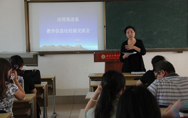 为加快推进教学信息化,应用英语系于2015年4月7日在综合楼AE202教室召开了“教学信息化经验交流会”。 会议由应用英语系刘然主任主持。