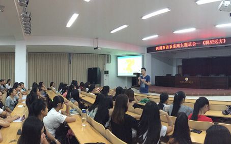 2015年5月20日晚,应用英语系系列主题班会第一轮巡讲最后一场在多功能报告厅顺利举行,报告厅内坐满的是我系13高职及14高职各班学生,这是我系迄今为止规模最大的一次主题班会,班会由我系辅导员潘立鹏老师主持,主题为《眺望远方》,主要从目标和理想两个方面进行讲述。