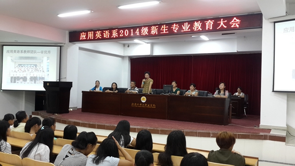 为了使14级新生对应用英语系专业方向有全面详细的了解,从而明确自己的就业目标,2014年9月13日晚上8点,我系在多功能报告厅为新生召开了专业方向介绍大会。此次大会由曹阳副主任主持,系部刘然主任、林鹏书记及各教研室主任均出席会议。