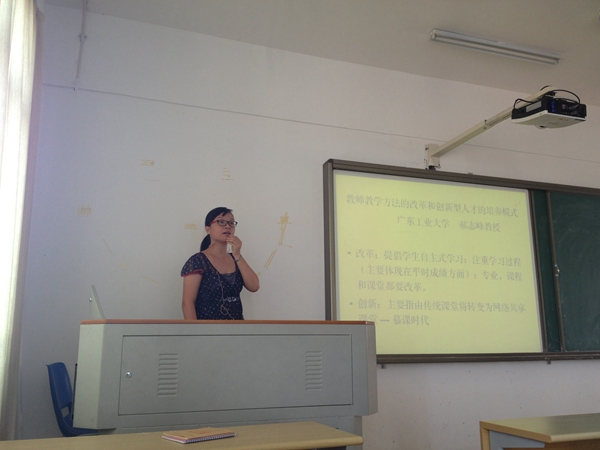 在教师交流会上,喻娟、杨丹老师两位老师介绍了暑期在成都培训的慕课、翻转课堂新理念,陈雁老师详细向大家介绍了秦皇岛学习培训的微课制作方法。三位教师的精彩汇报带给在场的所有教师耳目一新的教学方式,也引发了我系对网络教学方式改革的探讨。虽然新的教学方式非常具有挑战性,但为了提高我系课堂教学效果,老师们纷纷表示愿意努力尝试。