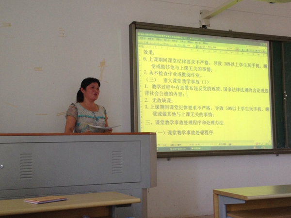 交流会后,张清萍副主任向大家宣读了教务处制定的《海南外国语职业学院课堂教学事故认定和处理办法》,并向在场教师征求意见。该办法将课堂教学事故分一般课堂教学事故(III)、严重课堂教学事故(II)和重大课堂教学事故(I)三类,并详细说明了课堂教学事故认定细则。