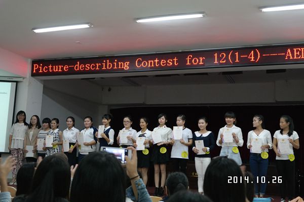 为丰富校园文化生活,营造英语学习氛围,提高学生的英语表达能力,海南外国语学院应用英语系于2014年10月26日晚7:30分在多功能报告厅举行了五年一贯制12级1-4班的英语情景描述比赛。