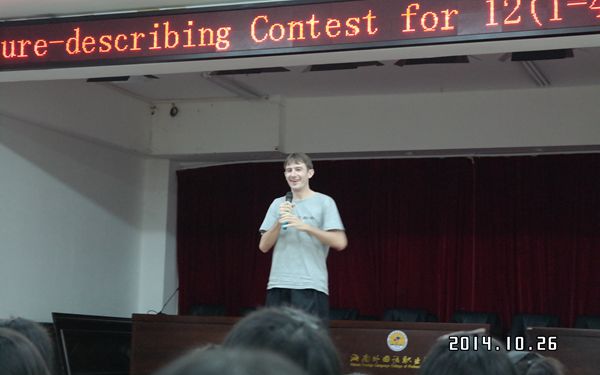 本次比赛分为两个环节。第一环节由参赛选手抽取一张所给情景图片在三分钟内完成描述和评论图片,第二环节为选手回答由外籍教师Richard的提问。该年级4个班共19名参赛选手向在场全体师生展示了自己独特的风采,用自己的才思敏捷以及扎实的语言功底赢得满贯喝彩。