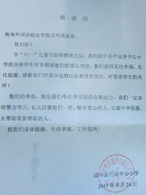在琼中县教育局黄主任的简短介绍下,由应用英语系的曹主任代表海南外国语职业学院发言,之后由曹主任亲自把衣服交到学校代表的手中,并且合影留念,孩子们天真灿烂的笑容让我们每个人心里都充满着温馨与愉悦。