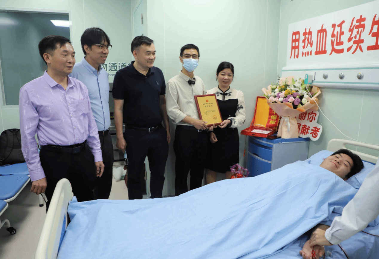 海南省红十字医学捐献服务中心主任周仲仁,我院党总支书记吴清晖、副书记韩吉光,以及文昌市红十字副会长蒙飞宇等领导,特意前往医院探望并慰问张艺文。周仲仁对张艺文的义举给予高度评价,代表受捐家庭对其大爱行为表示敬意和感谢,并叮嘱他要好好休养身体,继续关心造血干细胞捐献事业。
