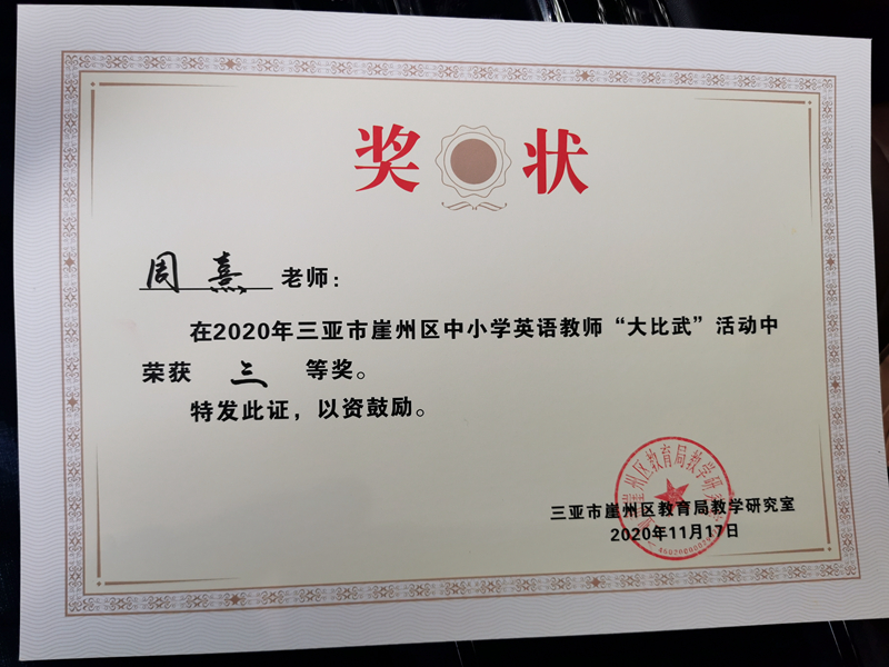 2020年11月参加三亚市崖州区中小学英语教师“大比武”活动荣获三等奖。