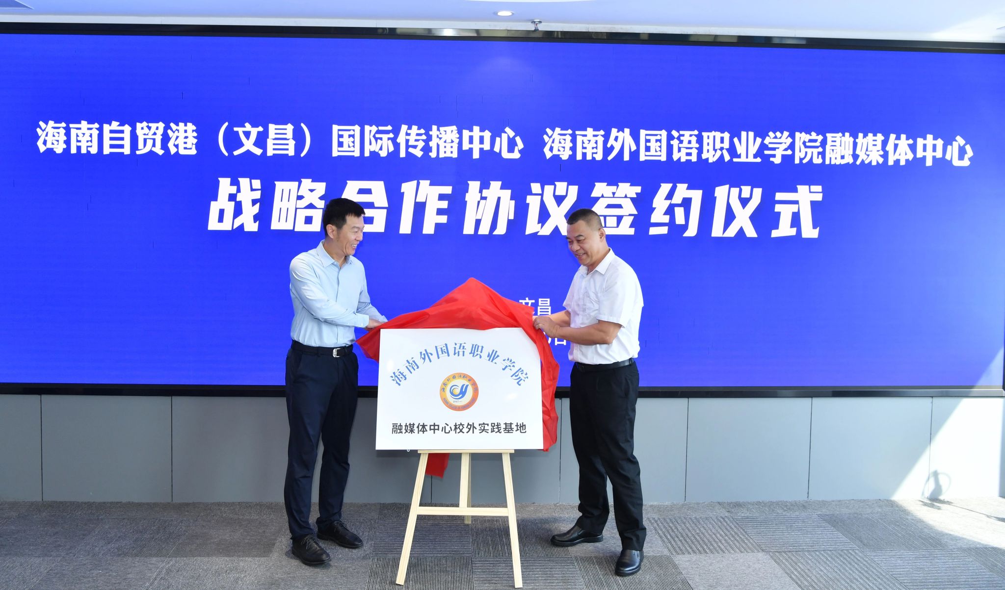 随后,梁松、魏波共同为海南外国语职业学院融媒体中心实践基地揭牌,并见证双方合作协议的签署。