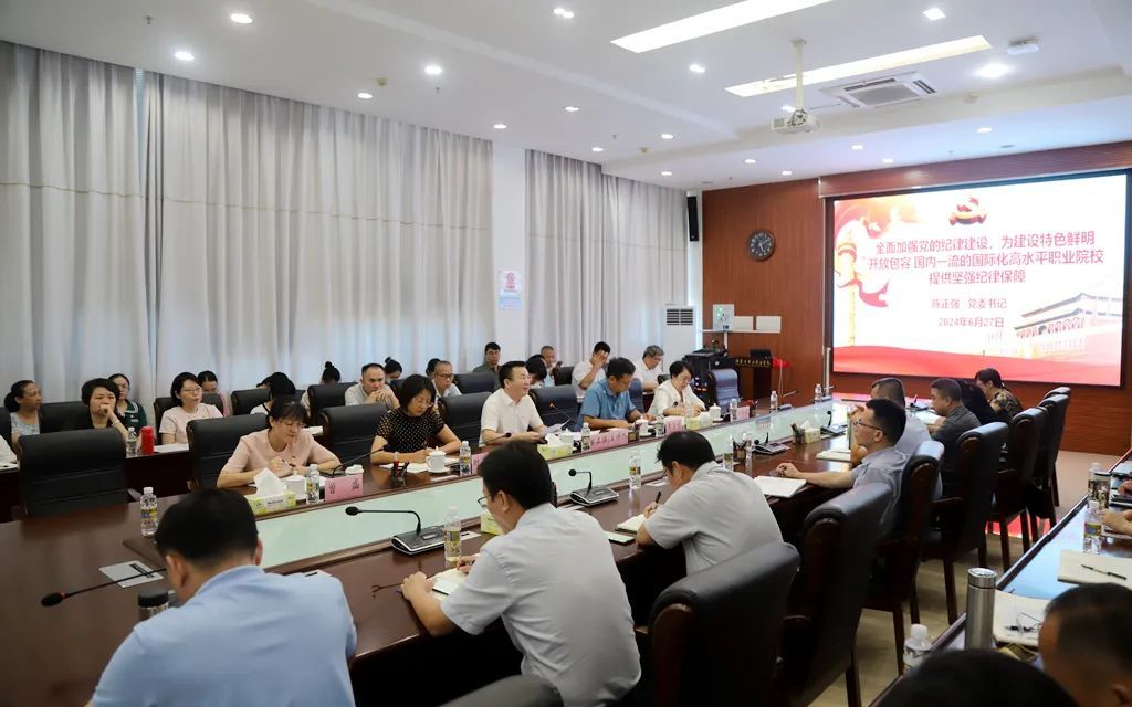 为深入学习贯彻习近平总书记关于全面加强党的纪律建设的重要论述,进一步教育引导党员干部强化纪律意识、加强自我约束,扎实推进学校党纪学习教育走深走实,6月27日,学校党委书记陈正强以《全面加强党的纪律建设 为建设特色鲜明开放包容国内一流的国际化高水平职业院校提供坚强纪律保障》为题,为广大党员干部讲授纪律党课。学校领导黄学彬、时秀梅、邓颖颖、曾盛参加党课学习。